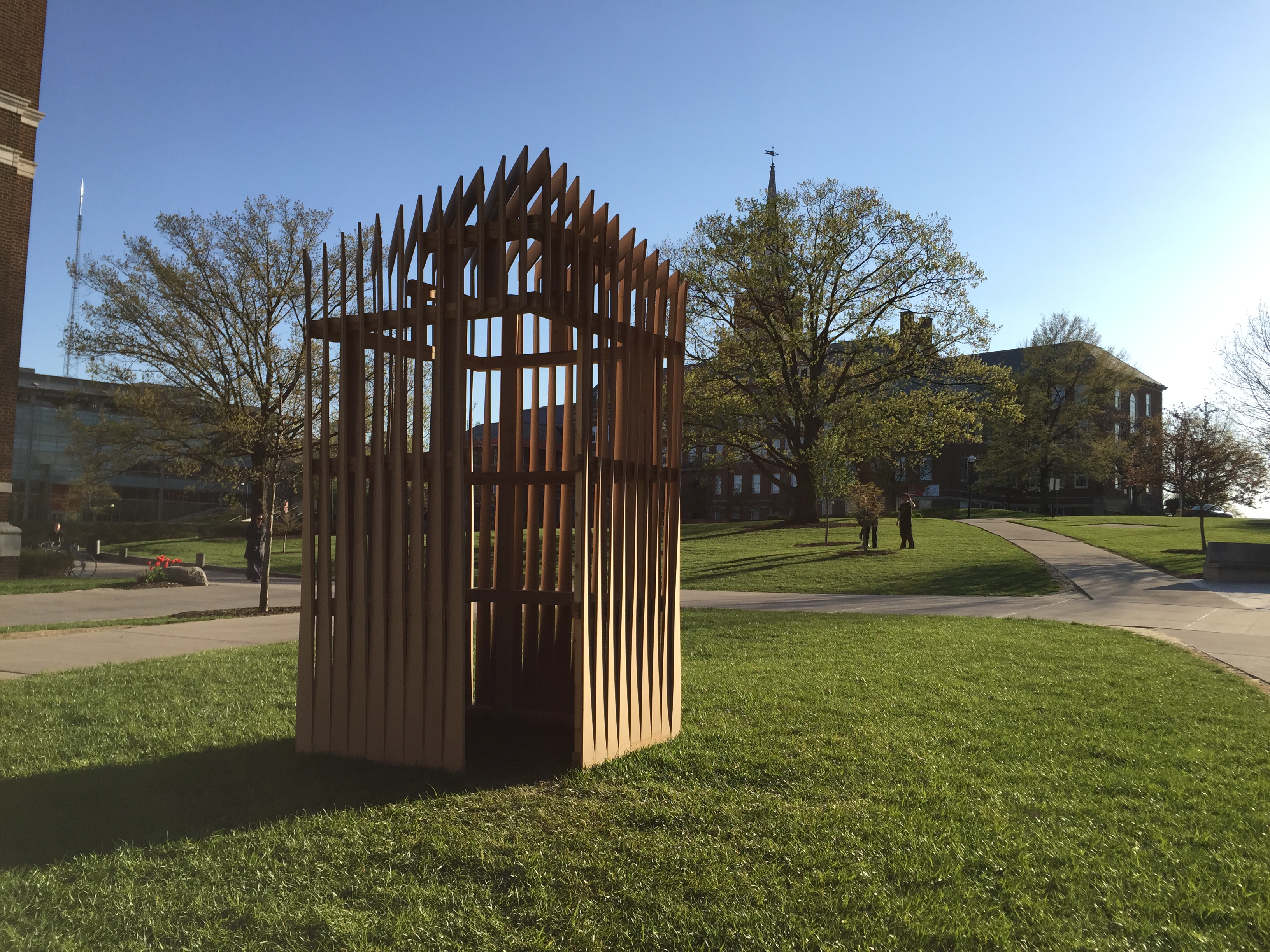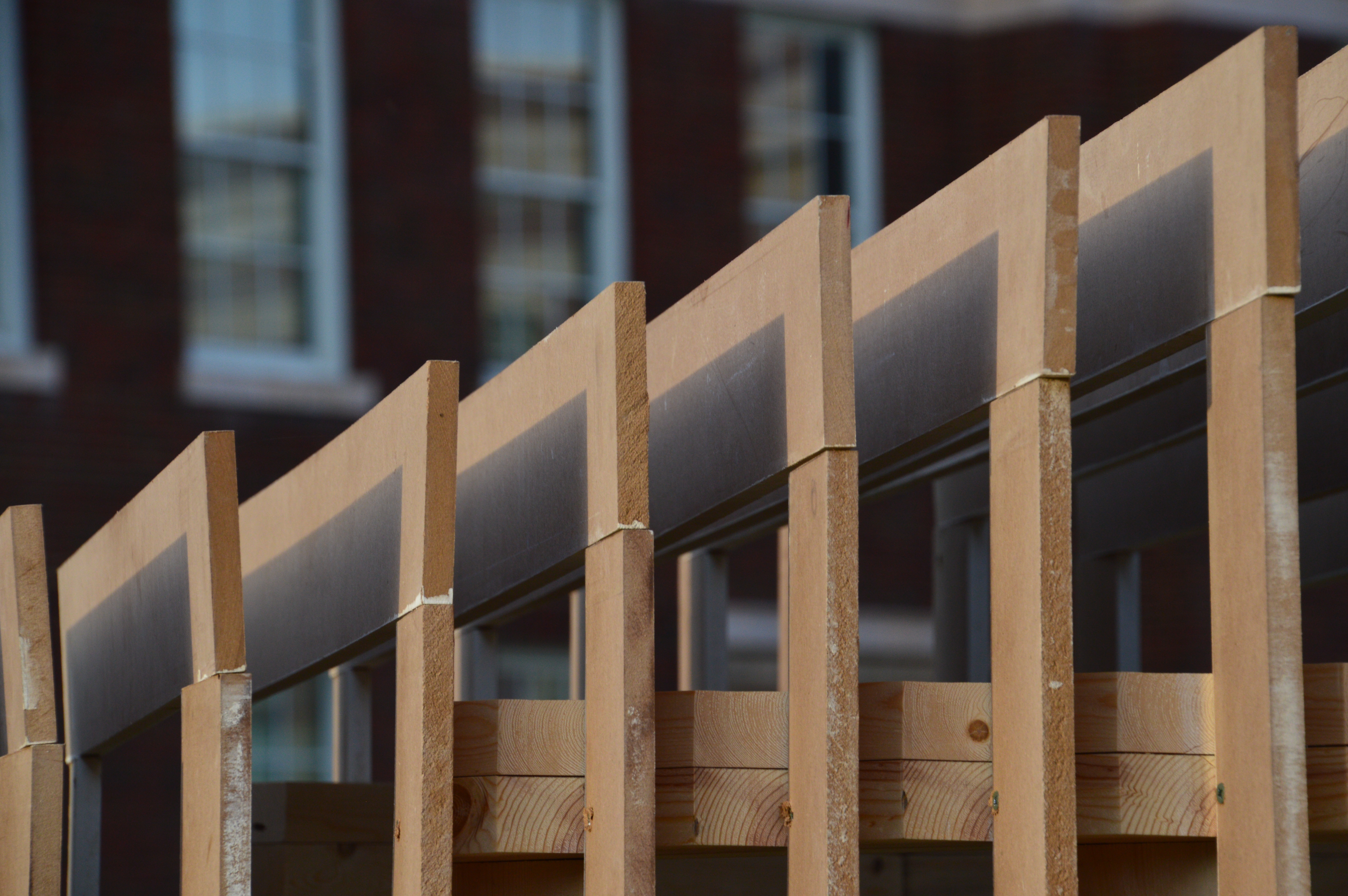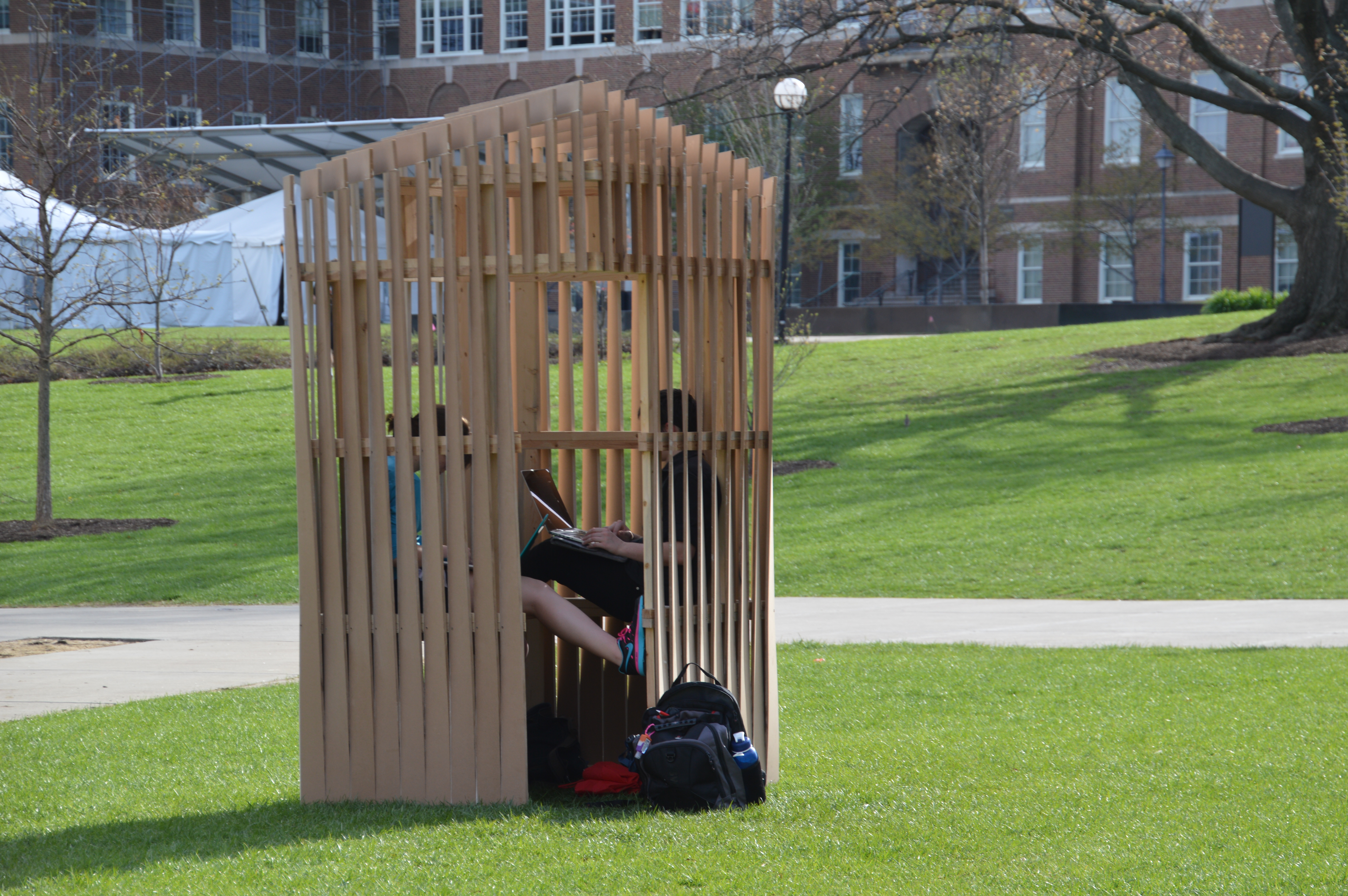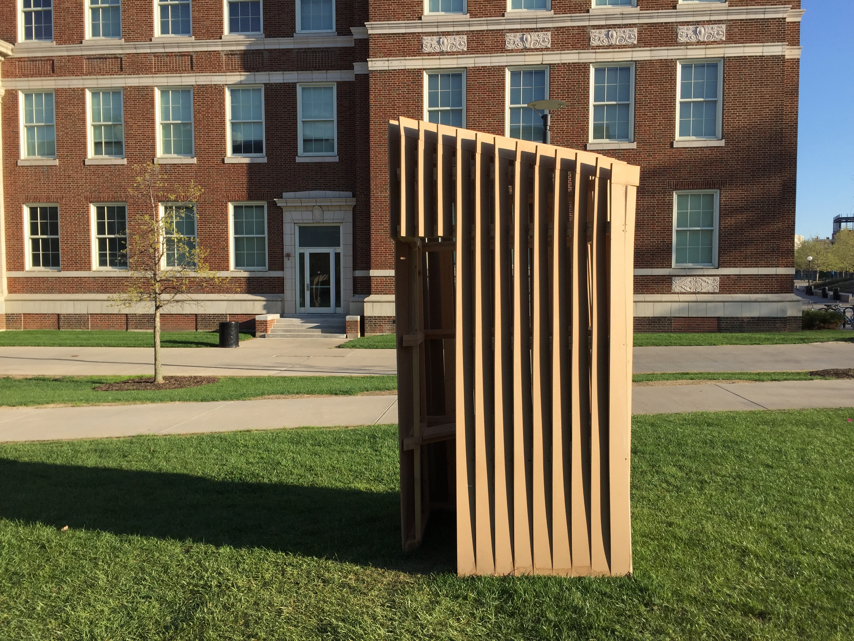 The Pavilion is an exercise in building at the human scale. In teams of six, students were asked to design and build a structure that occupied a 4’ x 4’ x 8’ space and addressed human proportion. Final structures are constructed from pine and MDF and occupied Schneider Quadrangle in a grid formation for over a week. As the team’s lead designer I was responsible for developing an aesthetically interesting design that addressed the project’s parameters and able to be constructed with the given materials. Our group experimented with material properties and found that the MDF, a perceivably dense material, could be twisted 45º across the 8’ height of the Pavilion by anchoring it in angled notches. This directed us toward creating a space that could be occupied and experienced from within while apprecieated equally from its exterior. We also ensured that elements directly applicable to users like the benches and the entryway were built to accomodate the human scale.