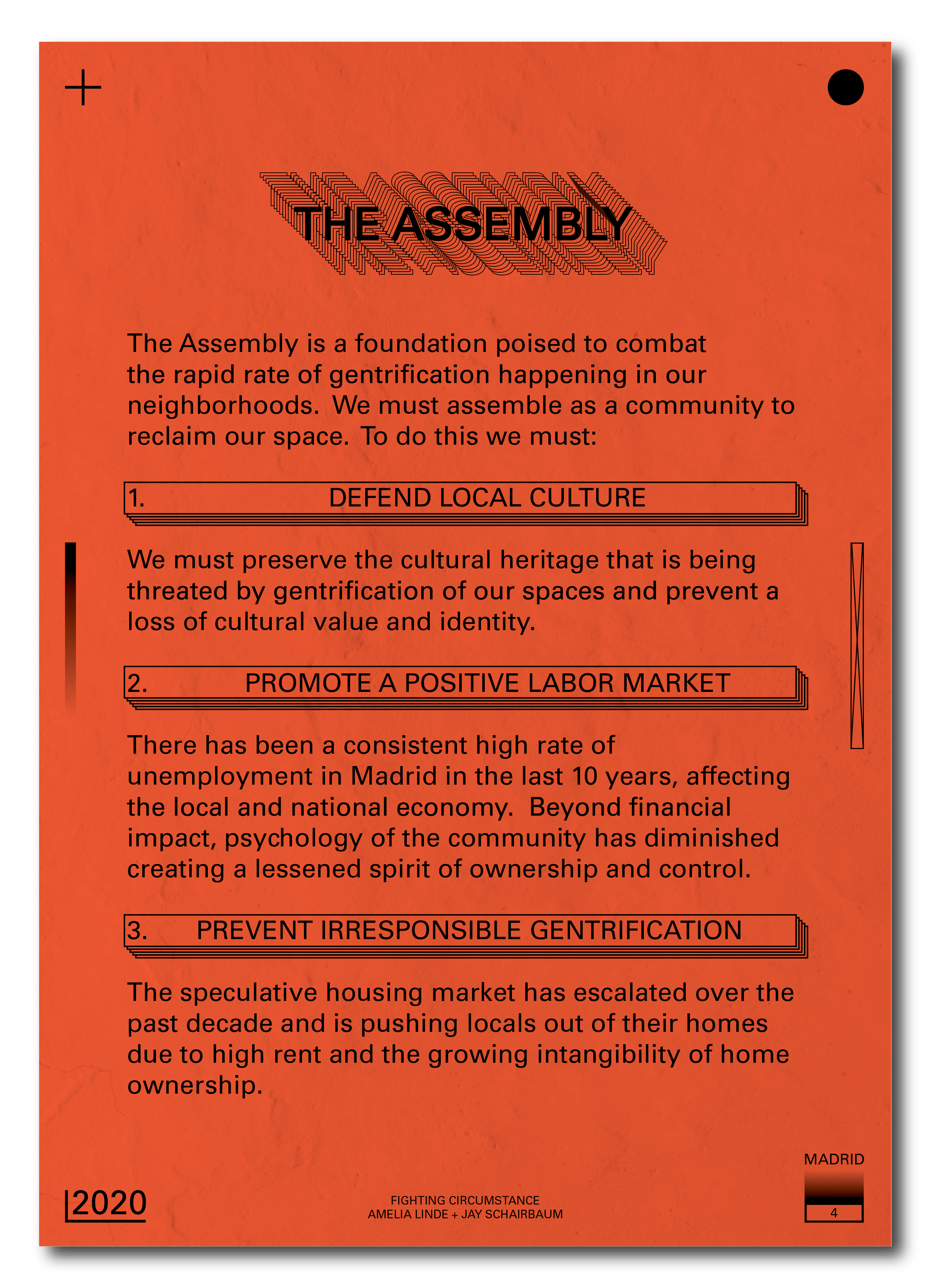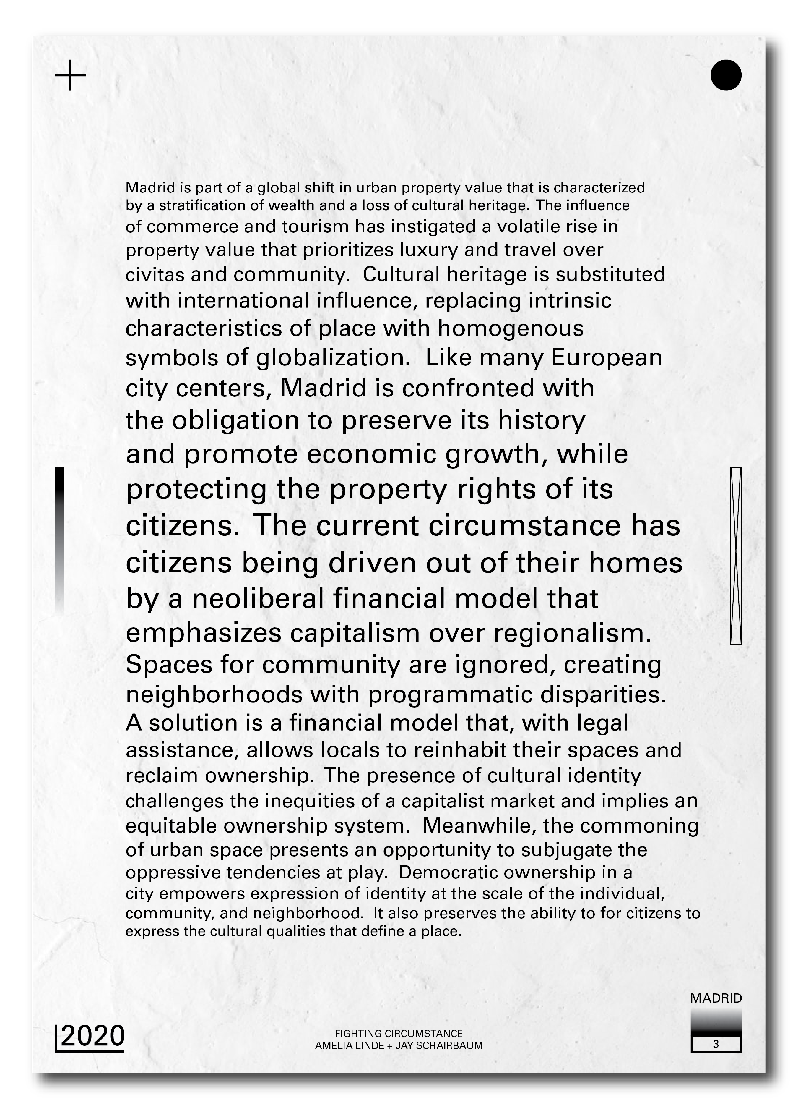 Madrid is part of a global shift in urban property value characterized by a stratification of wealth long spurred by property laws resulting from economic measures taken during the 2008 crisis. In 2015 a set of Urban Lease Laws that had been regulating property and rents expired after 20 years of protection. Since then, rents have increased an average of 25% with extreme cases exceeding twice their 2015 value. The neighborhoods experiencing the most abrupt changes are Malasana and Lavapies. Both are largely residential areas adjacent to Madrid’s historic city center and are characterized by narrow, sloped streets, and local eateries. However, now they are the backdrop to a contentious fight between volatile, speculative housing markets and locals who wish to remain in the places they have lived most of their lives. The Assembly is a proposal for a new urban complex that uses a co-op financial model of property ownership, crowdsource funding, and phased modular construction, allowing for existing residents to claim ownership of their neighborhood while exhibiting their vibrant local culture.