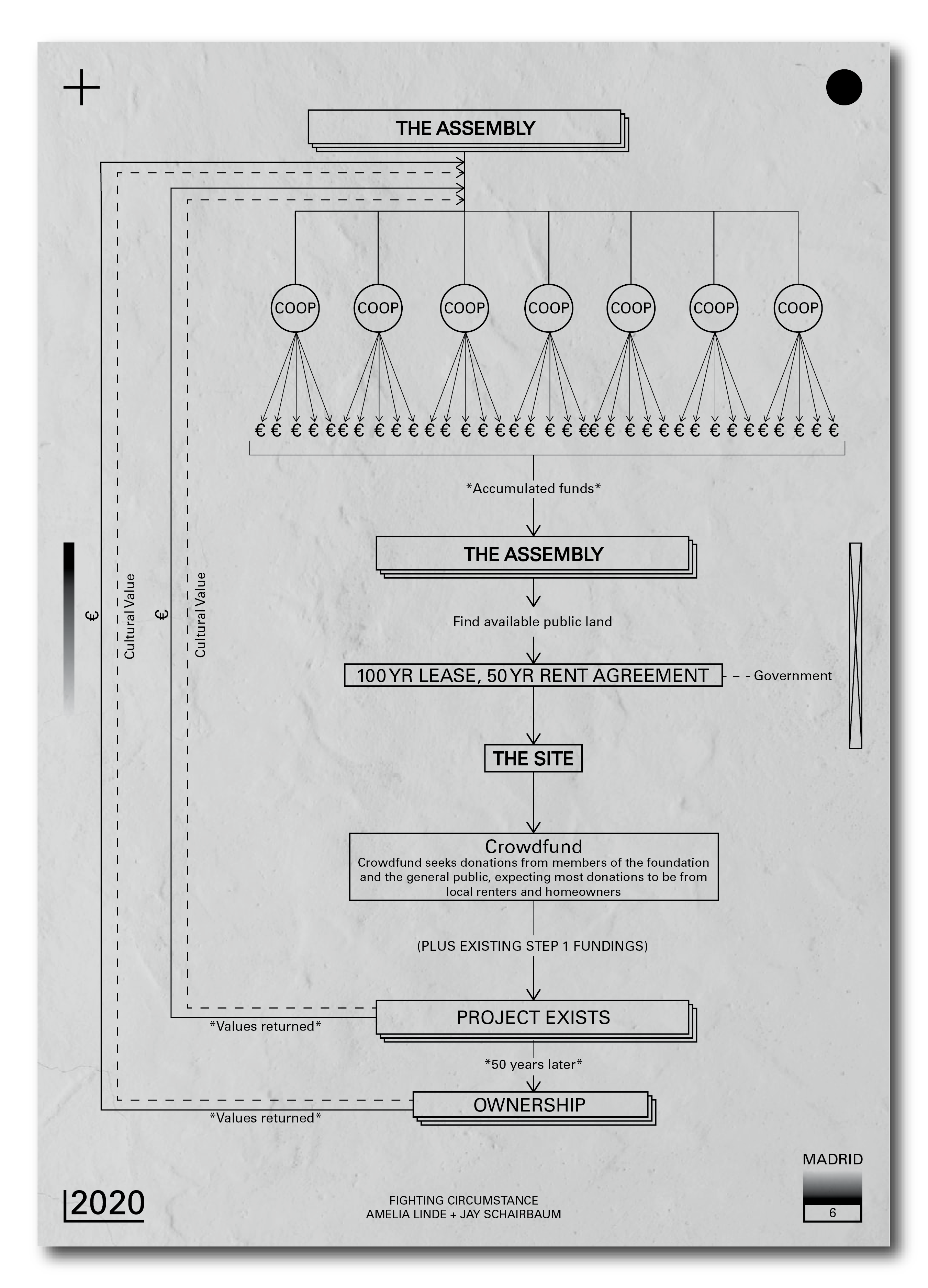 With assistance from the city, the ownership of the land would gradually be transferred to a network of existing co-ops in the surrounding neighborhood. This network would then put forth the required capital to complete incremental stages of the project, acknowledging that the upfront costs for this scale of construction would be difficult to provide at one time. The project is composed of four main structures that coincide with construction phasing: the assembly hall which houses maker spaces and a large gathering room, the co-op network foundation offices, co-op multifamily housing, and coworking offices. Each are arranged around a central courtyard that is able to host public events. At all stages the project is able to be used and occupied with an emphasis toward community engagement.
